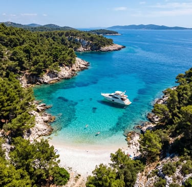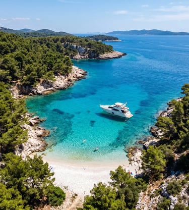 By midday we were threading toward Hvar, and this is where the day shifted gears. We slipped into the Pakleni Islands first — a string of pine-scented coves that don't appear on the standard Hvar island day trip story most people tell. Our captain knew a beach. Of course he did. White stones, water the color of a swimming pool in a film, and exactly four other boats, all of them small.