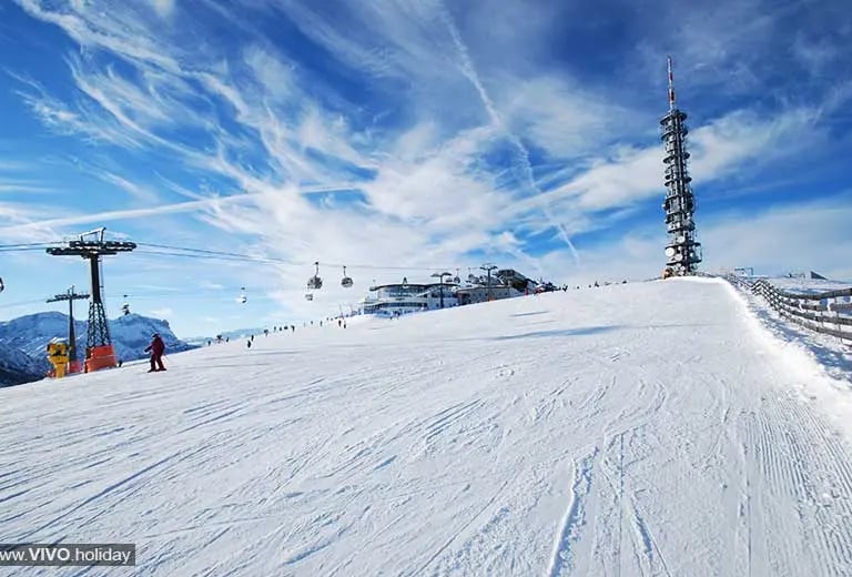 Futuristic architecture meets family-friendly slopes at Kronplatz. The 119km of terrain includes the Sylvester run for experts and easy access to the Sella Ronda. Après-ski means infinity pools at Faloria Spa Resort and craft beers at Hütte 61.