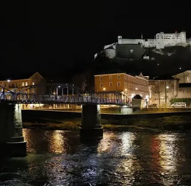 Return to the city for a golden-hour walk along the Salzach River. The Makartsteg pedestrian bridge offers postcard views of the fortress, while the riverside cafés on both banks serve aperitivos and Austrian wines as the sun sets behind the Kapuzinerberg.